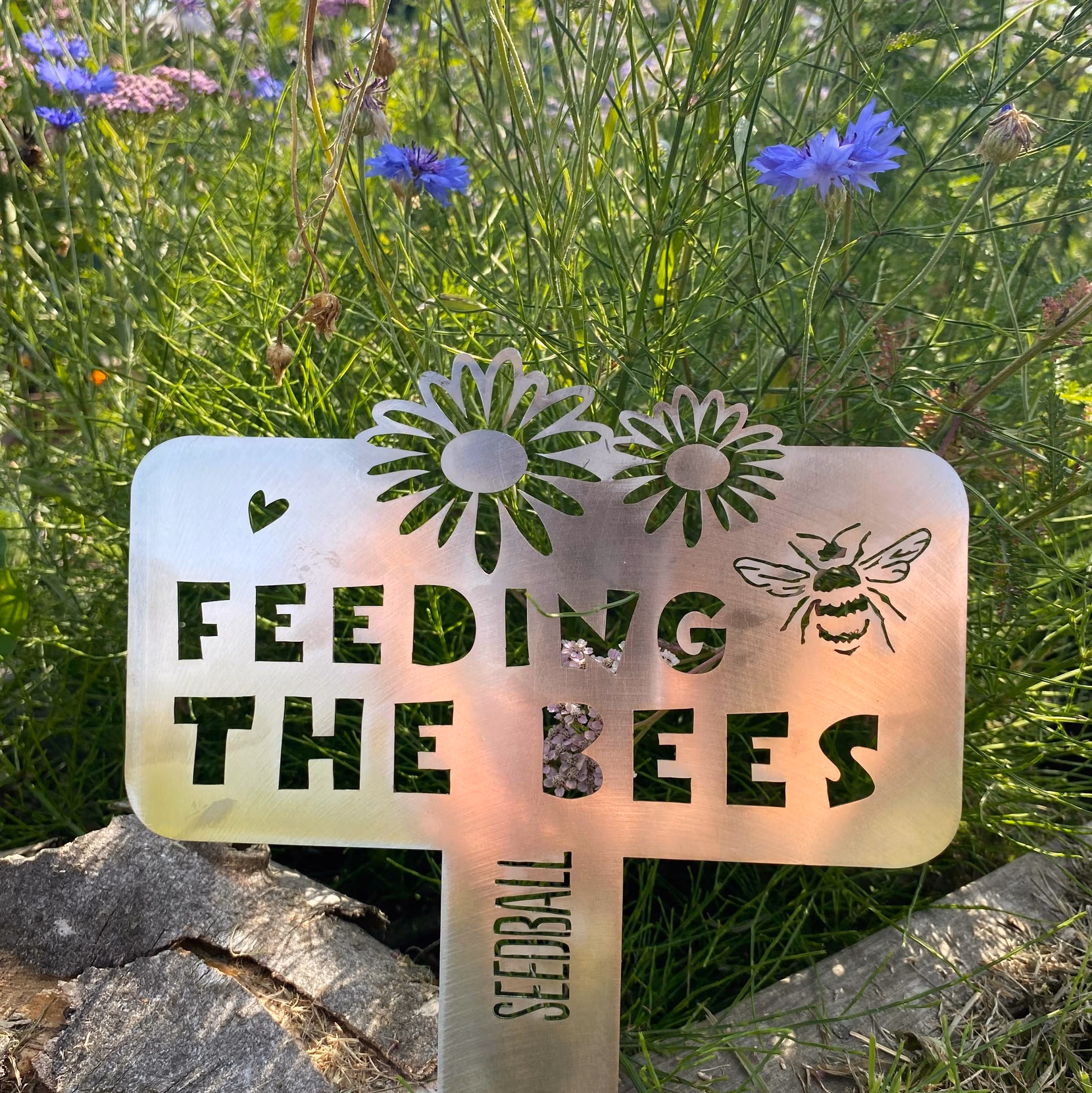 Steel sign with a stake to easily push into soil next to a wildflower patch.