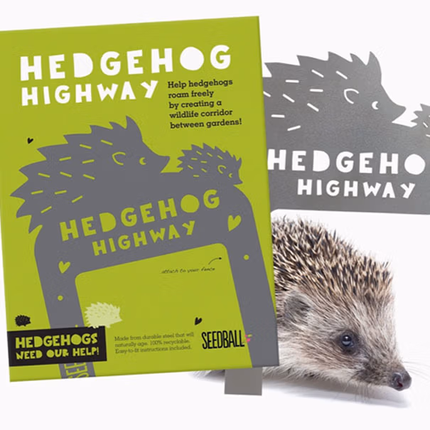 Steel sign and template for creating a 13 x 13cm hedgehog corridor between gardens. Attach to a fence (or any other barrier in a garden) and cut a corridor for hedgehogs to move between gardens. Easy to install instructions included.