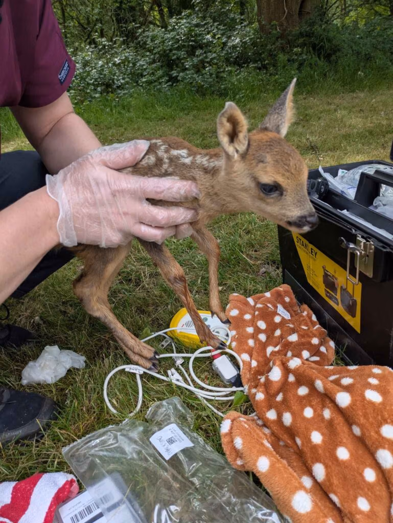 But, nestled in the undergrowth, was her first-born fawn, weak and cold, the fawn had already gone 24 hours without milk and warmth from her mum. The vet team headed back to the centre, with Hershey in tow.