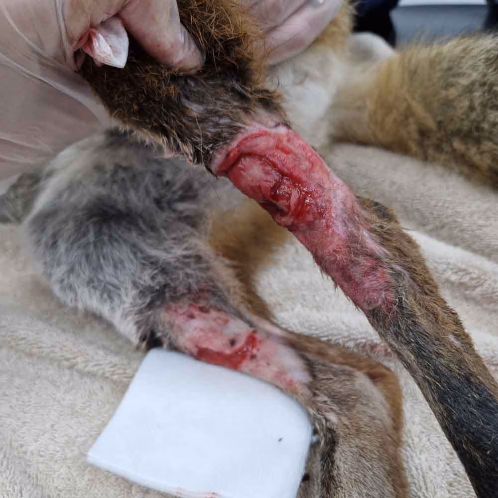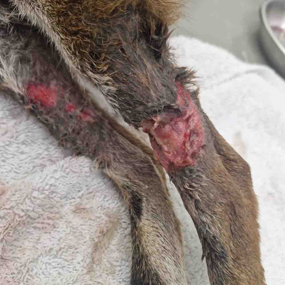 Deep wounds like these are not only excruciatingly painful but can also be life-threatening if infection or tissue death sets in. Our dedicated vets, Judith and Raul, immediately began a careful routine of cleaning and monitoring the injuries, performing regular debridement (removal of necrotic skin) to prevent further damage. Their quick action and persistence have kept the situation under control and given Bambi a fighting chance.
