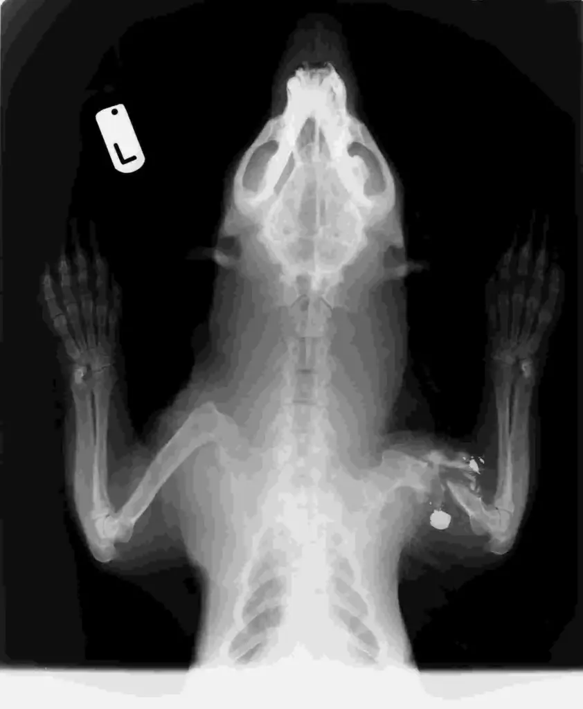 Rescued after being found in a pool of blood on the roadside, this poor male badger was rushed to the centre for treatment. Whilst we all, initially, thought it to have been hit by a car, an X-ray and examination soon exposed a far more disturbing truth.