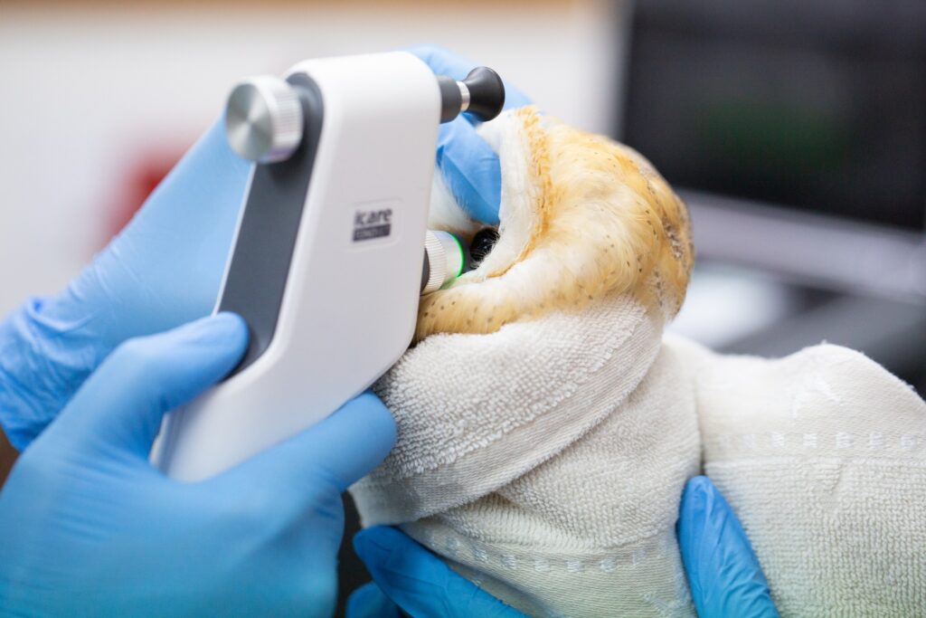 Our on-call vet, Meriem, got all suited up to pre-assess Barney in our quarantine unit, where he was checked for symptoms of avian influenza(AI) before entering the centre. Happy that he was symptom free of AI, Meriem gave Barney a full assessment, including making use of our kindly gifted iCare Tonovet Tonometer, once again, to check both of Barney’s eyes for signs of trauma.