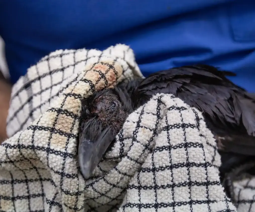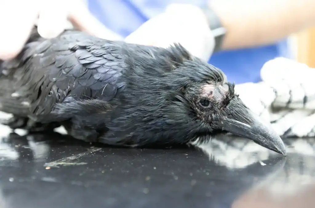 Found grounded, when the large corvid arrived he was unable to stand without assistance. From his physical appearance the crow looked pretty beat up, with a swollen forehead and bruises around his eyes.