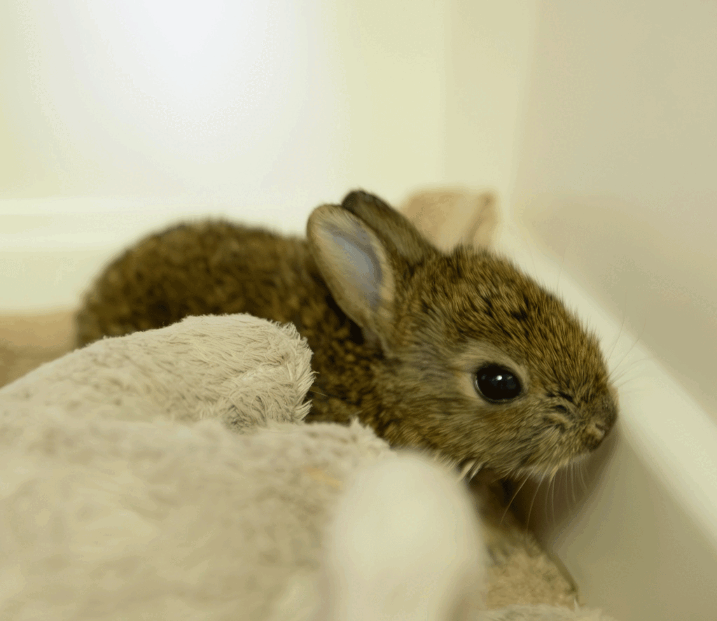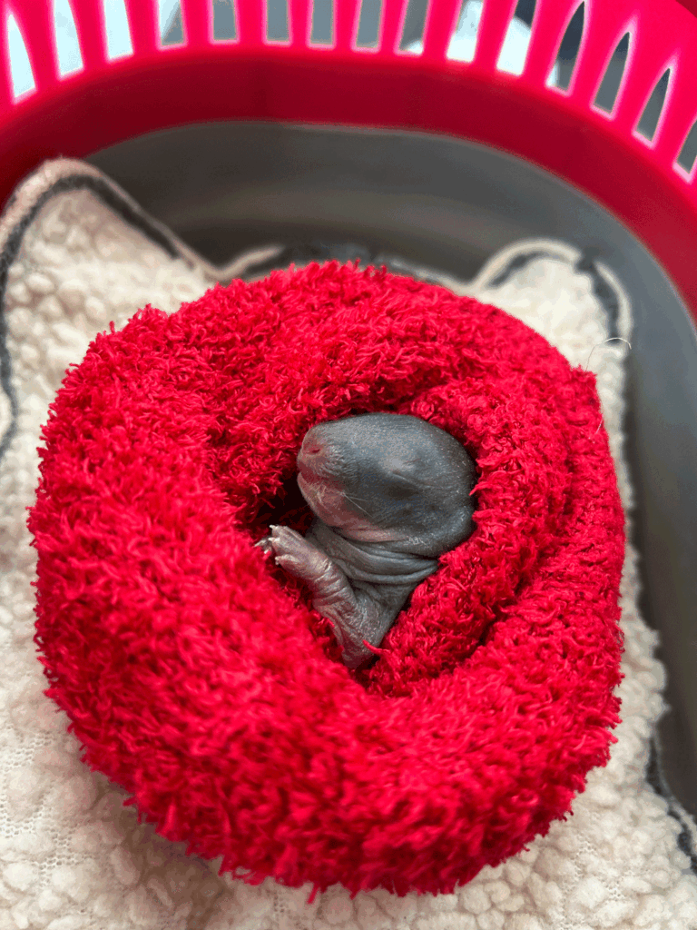 This tiny 39g rabbit kit, only a few days old, arrived after his nest was disturbed. Sadly, with no sign of mum or siblings, and the little one being pretty unresponsive, the finder swooped in, scooped up the hairless cutie, and whisked him off to one of our amazing volunteers, who knew just what to do.