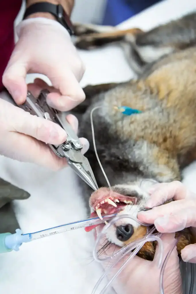 After discussing the situation with a dental specialist, a plan was made to try and realign and fix her jaw. With the fox sedated, Marco used a special cerclage wire to hold the sections of bone in alignment until a callus could form, reforming her jaw shape in the process.