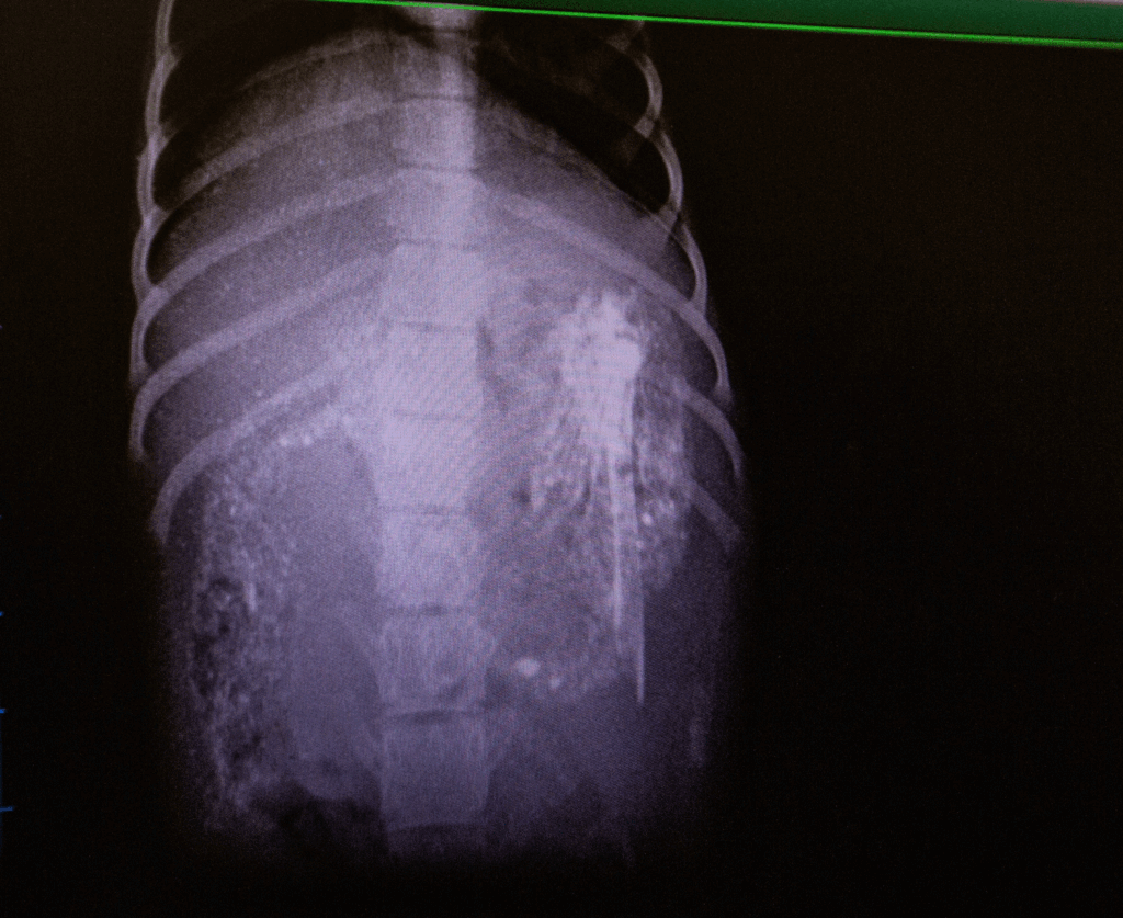 When observed walking, Jam also showed discomfort around his hips. An X-ray was carried out, which, thankfully, revealed no sinister reasons for the bleeding ears, however, the discovery of a large bone in his stomach that appeared to have a sharp end, caused more concern.