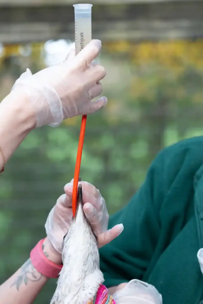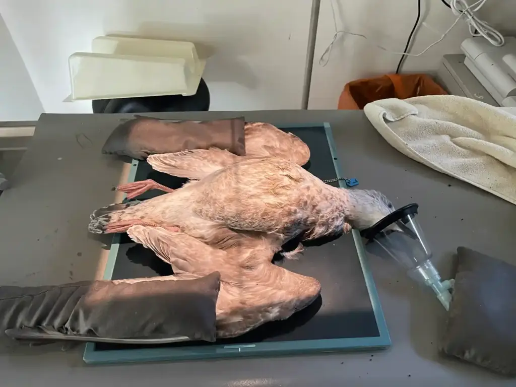 With his X-rays clear, he’s been placed into one of our large pond aviaries, where he can stretch his wings, have a paddle, and receive food on tap!