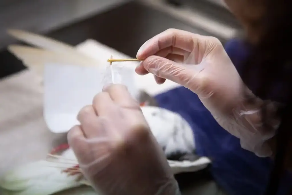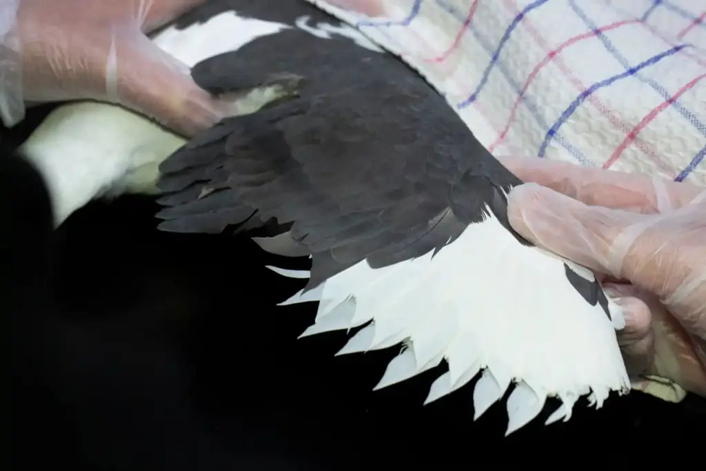 Working together using colour-matched feathers from a donor bird (one that had, sadly, already passed away), Marco and Meriem set to work on the imping procedure. Each feather was carefully measured and cut to size before being glued into the existing feather shaft using an internal wooden dowel. With care being taken to preserve the shape of the wing (vital for flight) both wings were looking as good as new in no time!