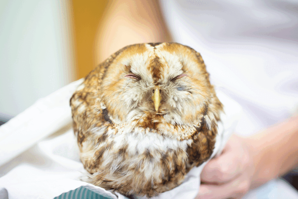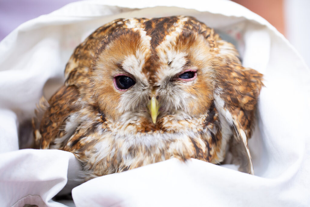 This rather sorry looking Tawny Owl, nicknamed “Twitter”, is a victim of something we see quite often here at headquarters, a Road Traffic Accident.
