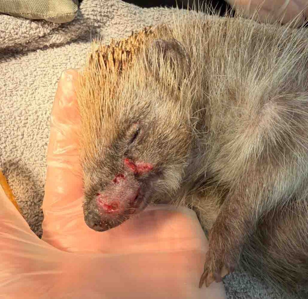 Despite everything he’s endured, there’s a glimmer of hope. Weighing in at over 900 grams, he’s one of the healthier hogs we’ve seen in recent weeks — which means he’s got reserves of strength on his side. Still, we remain puzzled as to how he sustained such unusual and painful injuries.