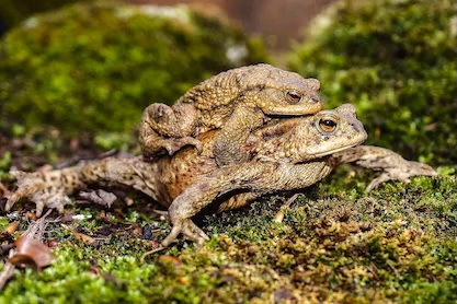 Famous for their mass migration back to their historic breeding grounds during spring, the larger females can often be spotted carrying the smaller males back to the ponds, where the female will then lay between 3,000 to 6,000 egg spawn.